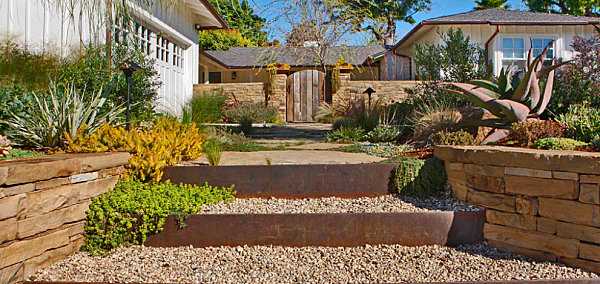 Другой путь создания чисто современного стиля – использование металлической окантовки, подпорных стен и плантаторов. Эта техника стилизует пространство и делает очертание местности приятнее. (Big Red Sun)