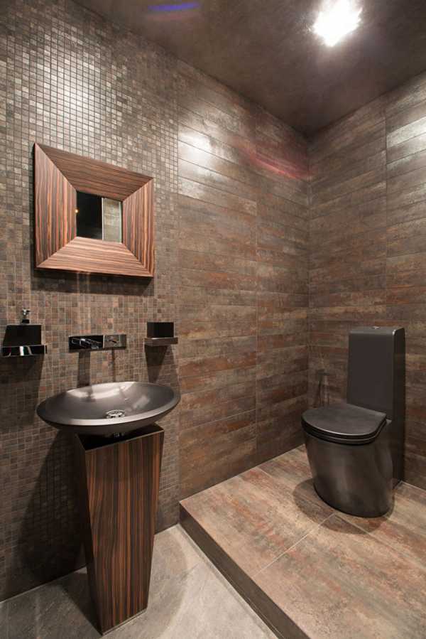 Кофейные оттенки в дизайне туалета всегда выглядят стильно и дорого. Главное – не переборщить. Коричневые цвета отлично смотрятся в сочетании с металлическими и деревянными элементами декора, а также с белоснежной сантехникой, которая визуально будет казаться еще белее. Гармоничное сочетание контрастов создаст особенный стиль интерьера санузла.