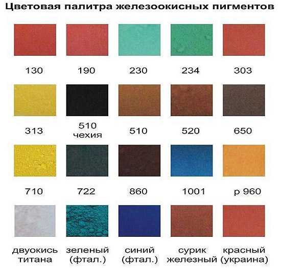 - минеральные пигменты вводятся в рабочую смесь в соотношении 1-5% от массы цемента. Конечный показатель зависит от плотности и прочих свойств материала;