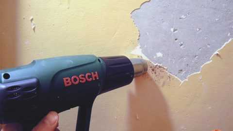 - С его помощью необходимо разогревать краску до тех пор, пока она начнет плавиться, надуваться и отставать от стены. Затем ее удаляют при помощи шпателя.