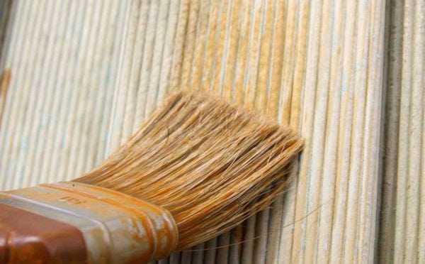 - малярной кистью. Расход краски по сравнению с краскопультом увеличивается. Инструментом работают вдоль волокон древесины, в обратном направлении остаются полосы;