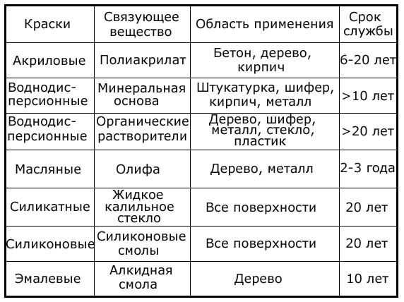 Таблица применимости фасадных красокК качеству работ относится не только, какая краска для покраски стен в своей квартире выбрана, но и точность соблюдения технологии ее нанесения в соответствии с рекомендациями изготовителя, тщательности проведения подготовительных операций.