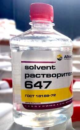 Р-647 — это прозрачная жидкость на органической основе, имеющая резкий запах. В состав растворителя входят: