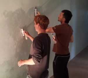 Второй слой, который собственно и дает эффект, наносят кистью, после того как первый подсохнет. Затем покрытие, не допуская его высыхания, разглаживают специальными инструментами, чаще всего кистью — разгоняя песок по поверхности, декорируя ее. Если стены должны иметь выраженный рельеф, можно использовать валик с мелкой структурой.