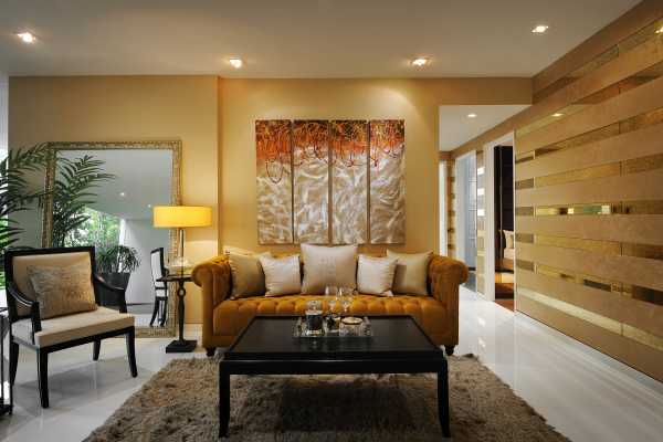 У песочной краски широкий ассортимент цветов. Для гостиной подходят глубокие тона, они делают комнату уютной.