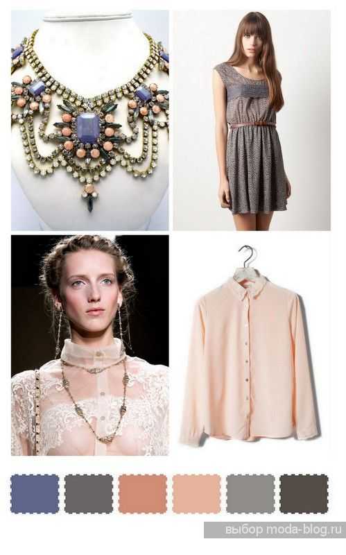 Это гармоничная гамма таких оттенков, как розово-кремовый, цвет манго, серо-голубой, сизо-серый, светло-каштановый, оливково-зеленый. Основным является контраст по светлоте, но и температурная разница тоже присутствует, при этом она смещена в теплую сторону противовесом которой являются серо-синие и серо-голубые оттенки.