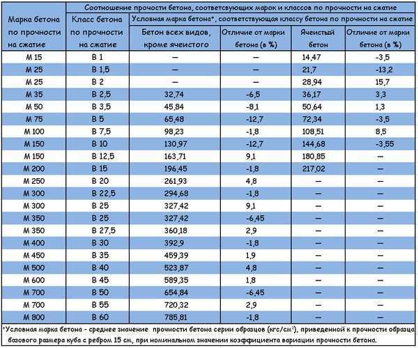 Существует и другая классификация – по классам прочности на сжатие бетона: от В1 до В22. Эти две системы классификации учитывают один параметр – прочность на сжатие. Отличие класса от марки бетона в том, что для марок (М) берется усредненное значение по прочности на сжатие, а для классов (В) – гарантированное. Средняя прочность бетона на сжатие – это средний показатель прочности проверяемых образцов, а гарантированное означает, что бетон имеет прочность не менее заявленной. При разработке проектной документации в спецификации указывается класс (В), хотя, в силу привычки, более распространенной является классификация по маркам. Ниже приведено примерное соотношение класса и марки бетона.