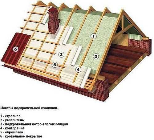 - уложив пароизоляцию на стропила под обрешеткой и гидроизоляцию (рубероид) поверх обрешетки под профнастил;
