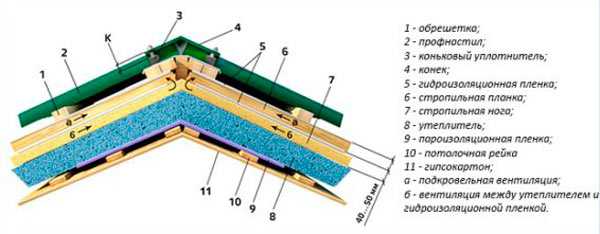 Любая кровля имеет достаточно сложное устройство, при этом каждый элемент конструкции выполняет свою особую функцию, обеспечивая в конечном итоге надежность и герметичность крыши из профнастила. Кроме кровельного покрытия в конструкцию кровли входит пароизоляция, гидроизоляция, тепловая изоляция и вентиляция. Ниже на рисунке показано устройство, так называемого, «кровельного пирога».