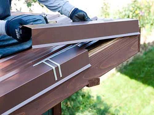 Выполняем установку нижней планки ендовы. Для этого делаем отбортовку или перегибаем верхний конек ендовы поверх конька крыши.