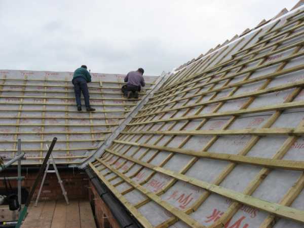 Если работают 2 или больше человек, поднять листы просто. Их укладывают на раму из 5–6 брусков пачками по 5–10 штук и по наклонным доскам, приставленным к обрешетке, затягивают веревкой наверх.