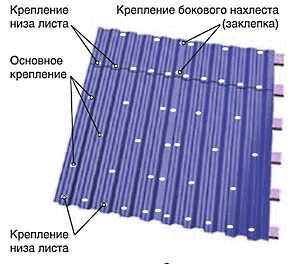 К верхним и нижним доскам обрешетки материал крепят, вкручивая саморезы в каждый прогиб волны, в центральные доски — через прогиб.
