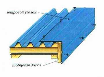 Специалисты советуют, приступая к монтажу крыши из профнастила, в случае, когда скаты имеют форму прямоугольника вначале установить торцовые доски. Это позволяет облегчить работу по размещению листов профнастила на крыше. К тому же верхняя торцовая доска должна быть установлена выше обрешетки, поскольку в дальнейшем торцовая планка крепиться будет именно к ней. Сделав все это, вы обустроите ветровой угол.