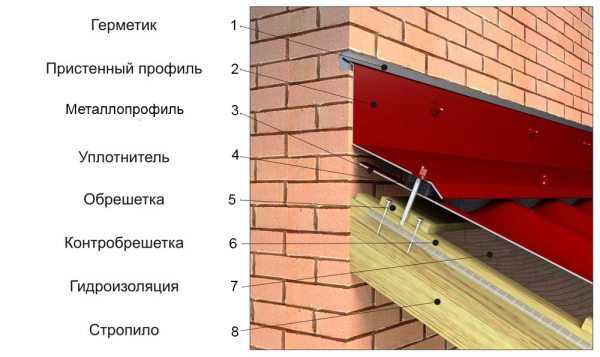 Планки примыкания, длиною в два метра, должны быть уложены с двадцати сантиметровым нахлестом. Необходимо укрепить планку примыкания при помощи саморезов со стороны, где она подходит к листам профнастила, при этом равномерность шага должна быть более 40 см. Для крепления к стене можно использовать штробу или же сделать так, чтобы ее скрывала обшивка.