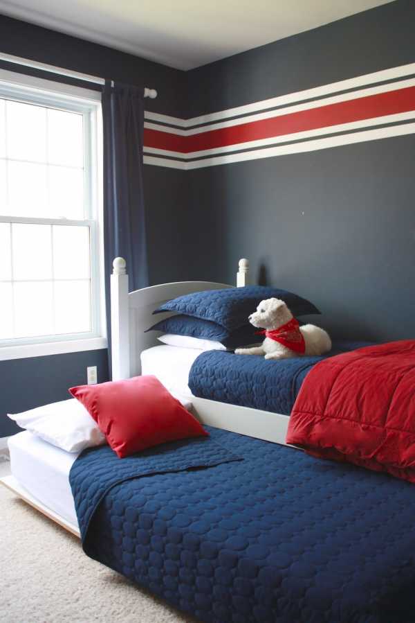 Детская для 2 мальчиков — это территория двух хозяев. С юных лет нужно научить их сосуществовать мирно и поддерживать друг друга. Но свое пространство нужно каждому. Для того чтобы обозначить границы территорий, используется зонирование.