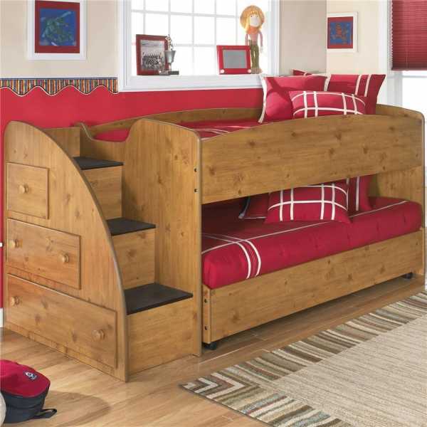 | Ярусы скреплены между собой. | Выдвижной нижний ярус перемещается автономно. | Выдвижная кровать, оснащенная ящиками. | Бюджетная низкая модель. |