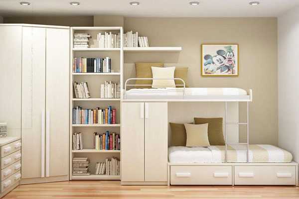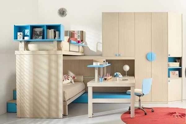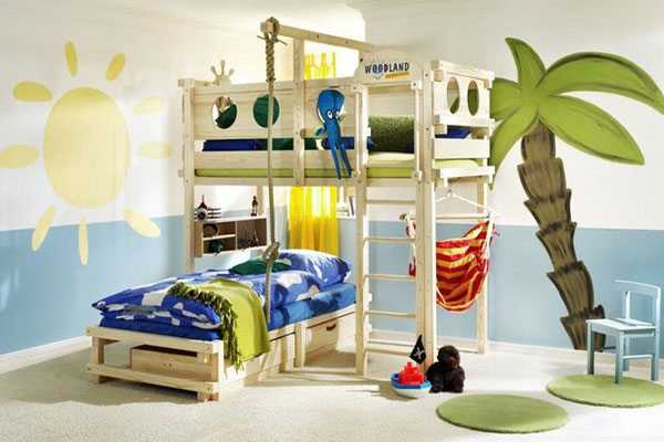 - Если детская совсем не велика, то подойдут кровати-чердаки и двухъярусные кровати. Альтернативный вариант — раскладной диван или мебель-трансформер (кровать, днем убирающаяся в шкаф или под стол).