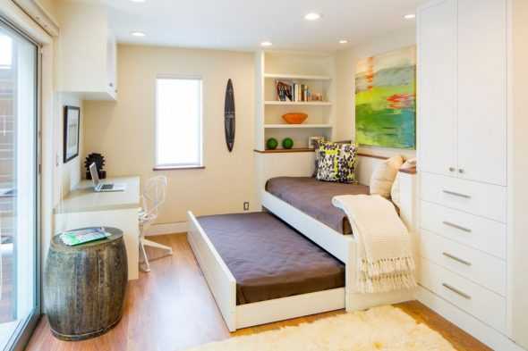 Идеальным решением организации спального места для двоих детей в небольшой комнате будет выдвижная кровать. В узкой длинной комнате ее можно поставить вдоль продольной или поперечной стены, при этом она займет минимум пространства.