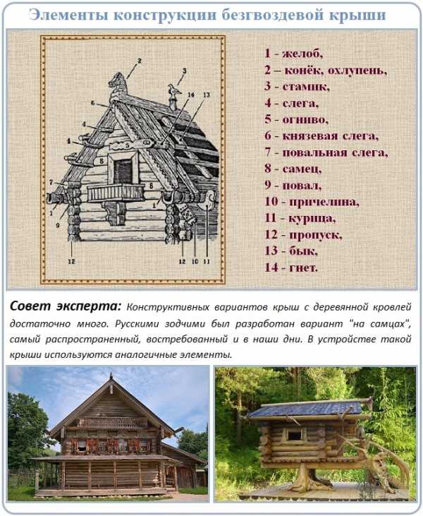 Сборка деревянной кровли всегда производится из штучных элементов. Технология укладки и принцип сооружения зависит от формы и размеров именно этих элементов, в числе которых значатся: