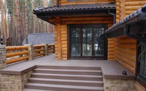 Для дома или дачи из оцилиндрованного бревна при строительстве крыльца рекомендуется использование такого же материала. Это не будет нарушать общей архитектурной формы.