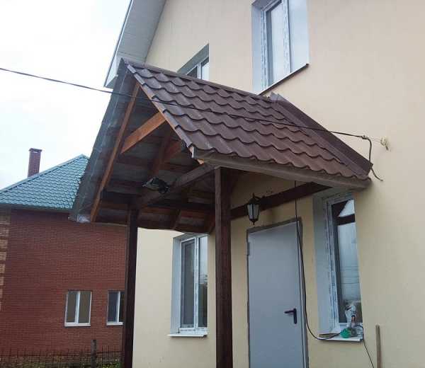 Отличием козырьков из металлочерепицы являются декоративные качества и прочность. Но такая конструкция может использоваться не для всех строений. Оптимальным вариантом считается применение однотипных материалов для кровли козырька и основной крыши.
