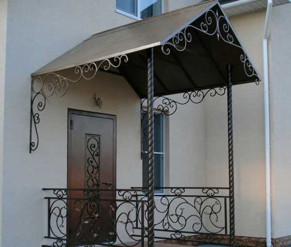 Роскошь и презентабельность — вот главное отличие кованых козырьков и навесов над крыльцом частного дома своими руками. Кованые декоративные конструкции становятся центральным элементом экстерьера. Кованые изделия отличаются высокой стоимостью, поэтому при желании можно сделать козырек с элементами ковки, отлично сочетающиеся с поликарбонатом, пластиком, металлочерепицей и листовым металлом.