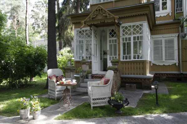 Этот навес на деревянных опорах, позволяет разместить на крыльце даже небольшую зону отдыха.