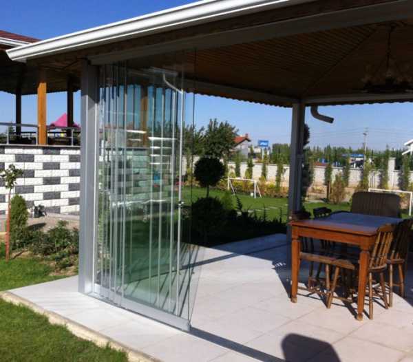 - Безрамное остекление. Самый современный и самый дорогой вариант, требующий профессионального монтажа. Пространство веранды будет отделено от сада прочными листами закаленного стекла. Они отлично пропускают свет, поэтому в помещении днем будет очень красиво и солнечно, особенно если веранда размещена с южной стороны дома. Безрамные стекла можно отодвигать, это позволит обеспечить удобный вход на веранду со двора.