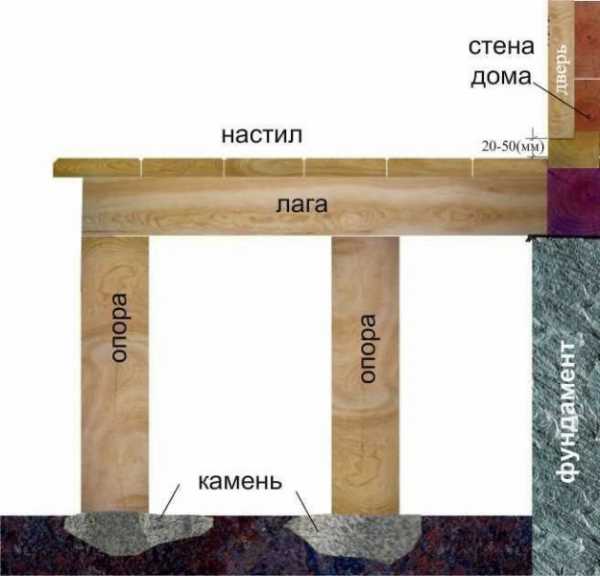 - Угол наклона. Это делается для того, чтобы избежать застоя воды на площадке крыльца при таянии снега или дождях.