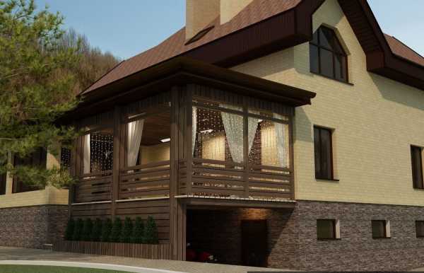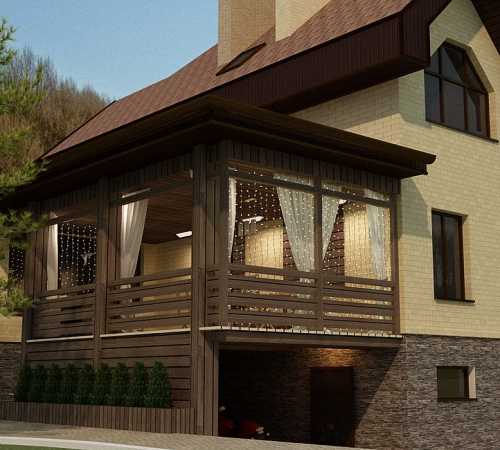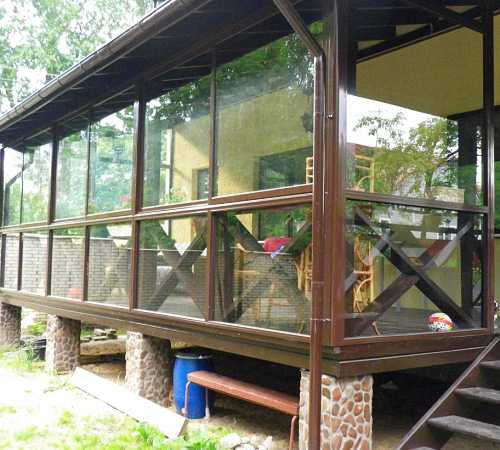 - Веранду – площадка закрытого типа. Она, в свою очередь, может быть закрыта частично или же полностью застеклена.