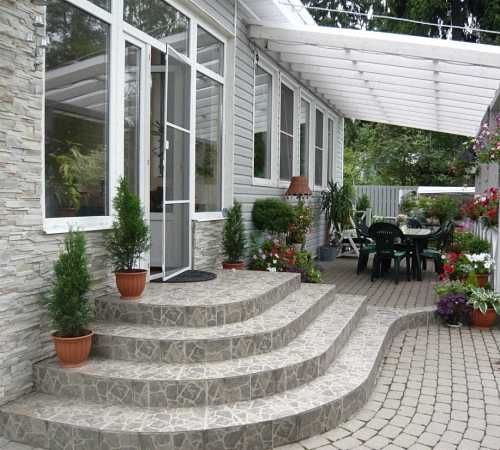 - Крыльцо-патио имеет дополнительное место для установки цветов или обустройства зоны отдыха. Оно имеет более сложную конструкцию.