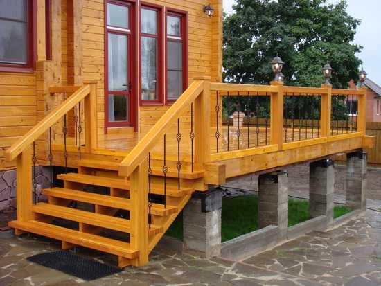 Некоторые частные дома в силу многих факторов, например, проекта и сурового климата строятся из дерева с высоким цоколем, что отражается и на конструкции крыльца. В этом случае оно устанавливается на сваи, что помогает поднять конструкцию на нужный уровень, при этом уменьшив затраты на фундамент.