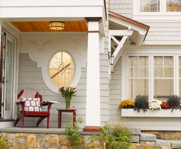 Как говорилось ранее, материал крыльца должен гармонировать с материалом дома. Детали экстерьера также здесь немаловажны: цветы в вазонах или подвесных кашпо, резные скамейки, причудливые фонари, плетеная мебель – все это сделает внешний вид веранды и крыльца наиболее привлекательным и уютным. Кроме мебели важным аксессуаром являются занавески или жалюзи, которые защитят веранду от чрезмерного попадания солнечного света и придадут атмосферу защищенности.