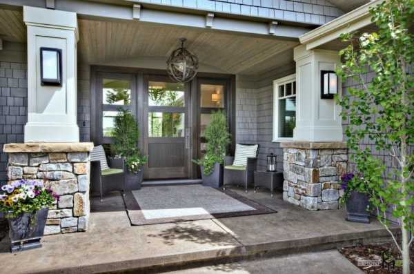 Крыльцо должно соответствовать общей стилистике помещения. Рекомендуется для этого использовать материалы дома и тот же цвет. Можно выделить основные элементы стиля и сделать на них акцент на крыльце: