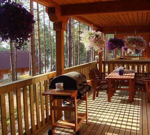 Уникальным местом летнего отдыха за городом может стать крыльцо-патио. Как говорилось ранее, оно не ограждается, но бывают и исключения. На таком деревянном крылечке можно будет удобно расположиться с любимой книгой или чашкой крепкого кофе.