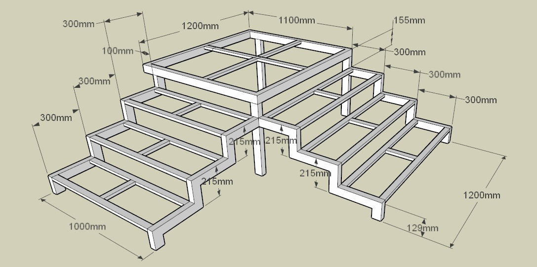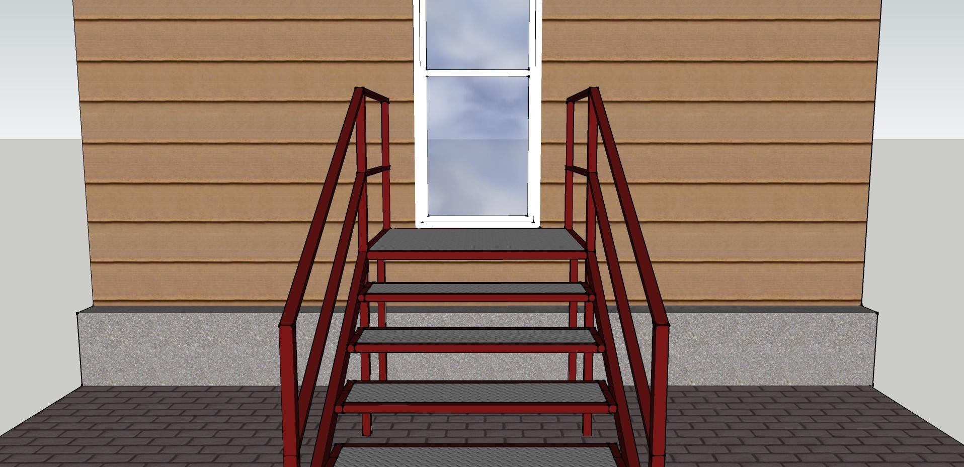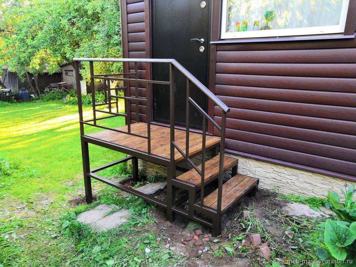 Широкое плоское основание, непосредственно примыкающее к дверному проему. На него приходится большая нагрузка, поэтому для его изготовления берутся толстые профильные трубы. - Лестница. Наклонная конструкция со ступенями, восходящая от уровня земли к площадке. Число ступеней зависит от высоты крыльца и угла наклона лестницы.