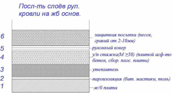 Количество слоев рулонных материалов зависит от уклона: > 15% — 2 слоя; 7-15% — 3 слоя; 2,5-7%- 4 слоя; < 2,5% — 5 слоев.