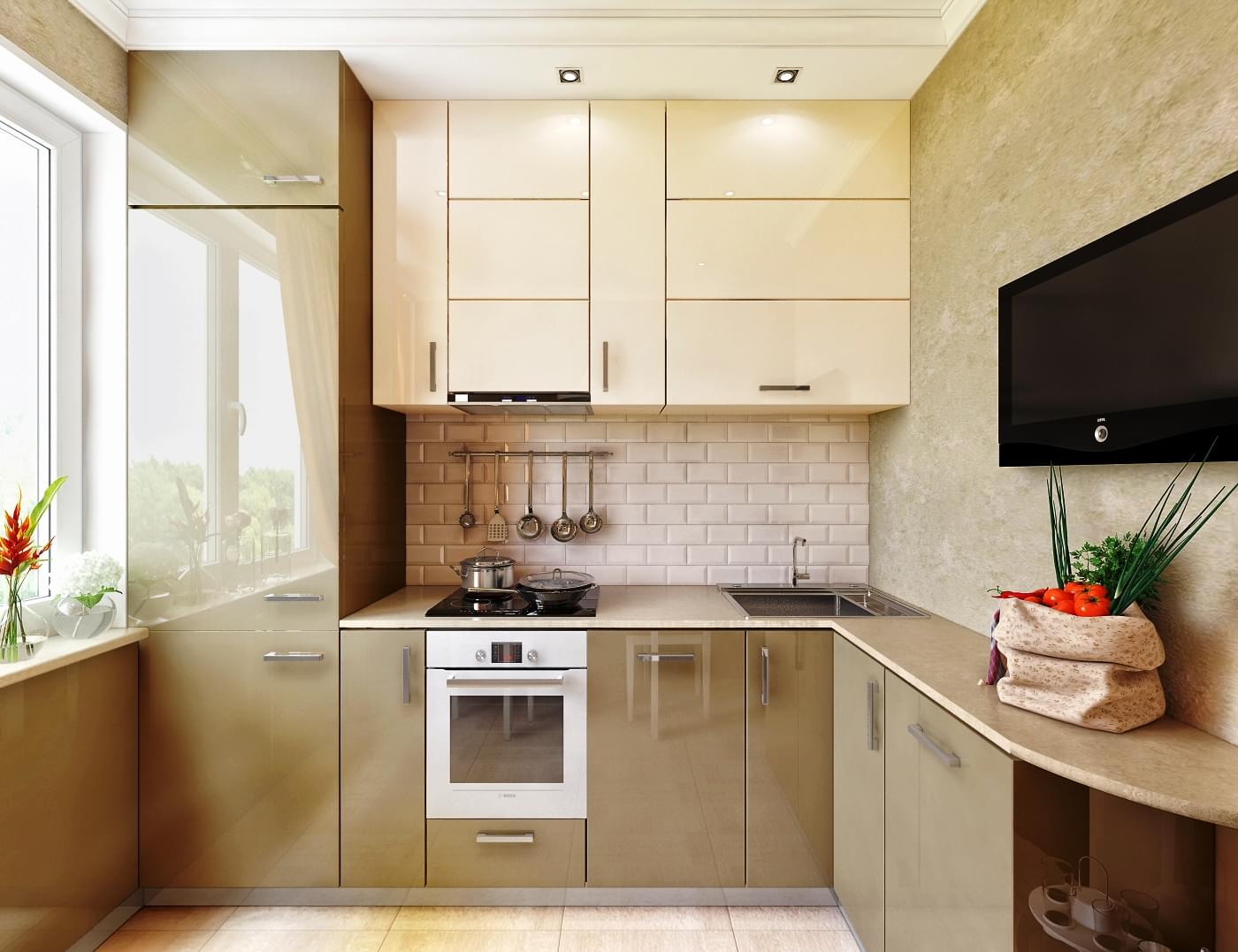 Подоконник можно использовать в качестве рабочей поверхности. Такой вариант удобен при расстановке гарнитура в угловой форме или в форме буквы «П». Если кухонная стенка имеет прямолинейную форму, то её можно разместить у окна. В такой ситуации придётся полностью отказаться от навесных шкафов. Фото дизайна угловых малогабаритных кухонь в хрущёвке можно увидеть ниже.