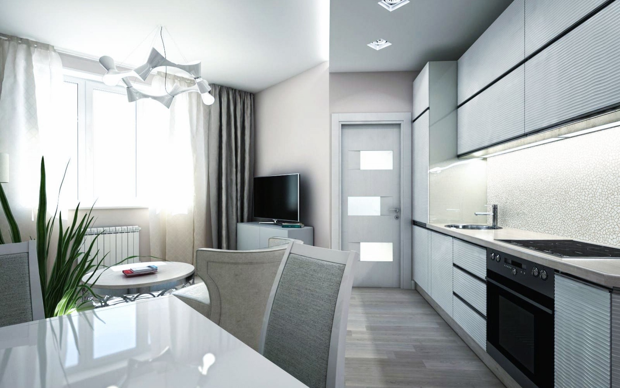 При оформлении кухни в такой квартире, главное занять минимум места. Создать такое место можно даже и на ограниченной территории. Только останется правильно придумать как расположить рабочие зоны. Для этого подойдет эргономичная мебель.