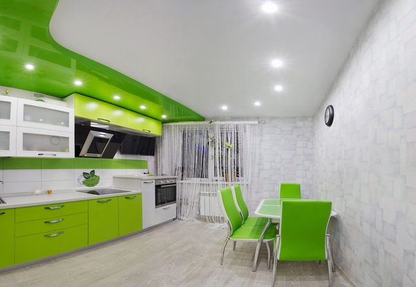 - Другая проблема – в большинстве случаев неровная потолочная поверхность, из-за чего сложно подобрать кухонный гарнитур по высоте. Опять-таки проблема решается за счет обустройства натяжного или подвесного потолка.