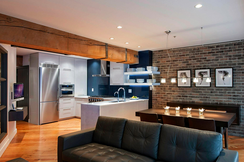 Правильное оформление стен помогает зрительно объединить функциональные зоны и создать целостный интерьер. Например, если кухонный фартук выполнен из камня, то переносим это покрытие и на стену, создавая плавный переход. В кухне-гостиной лучше всего использовать две-три разные отделки, цвета и фактуры которых перекликаются между собой.