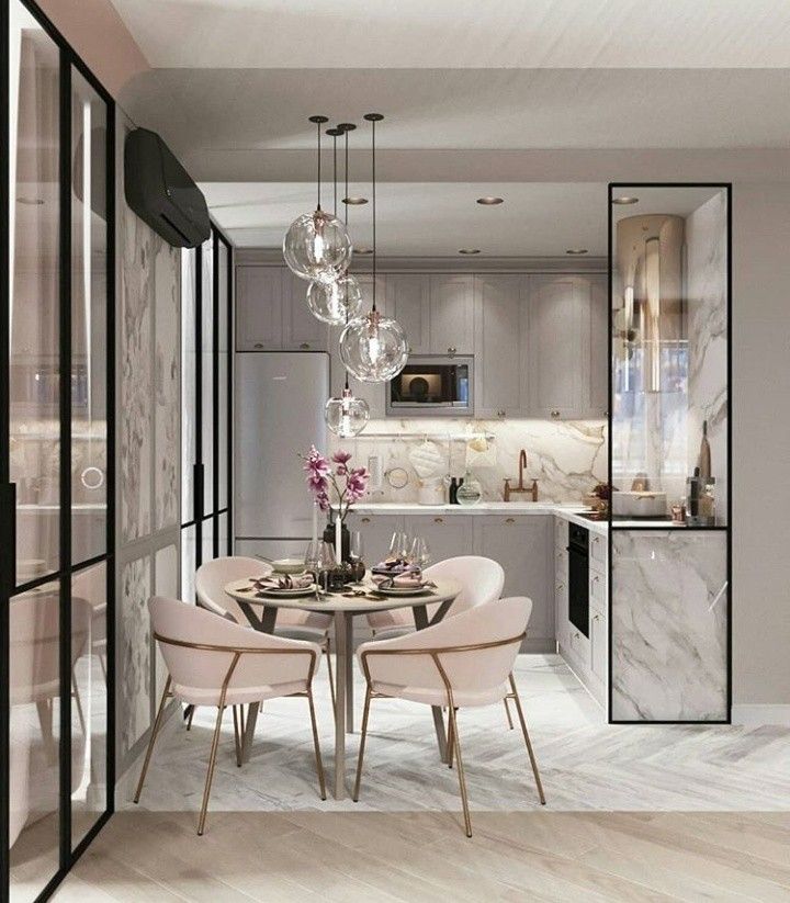 Стеклянные перегородки для зонирования кухни и гостиной