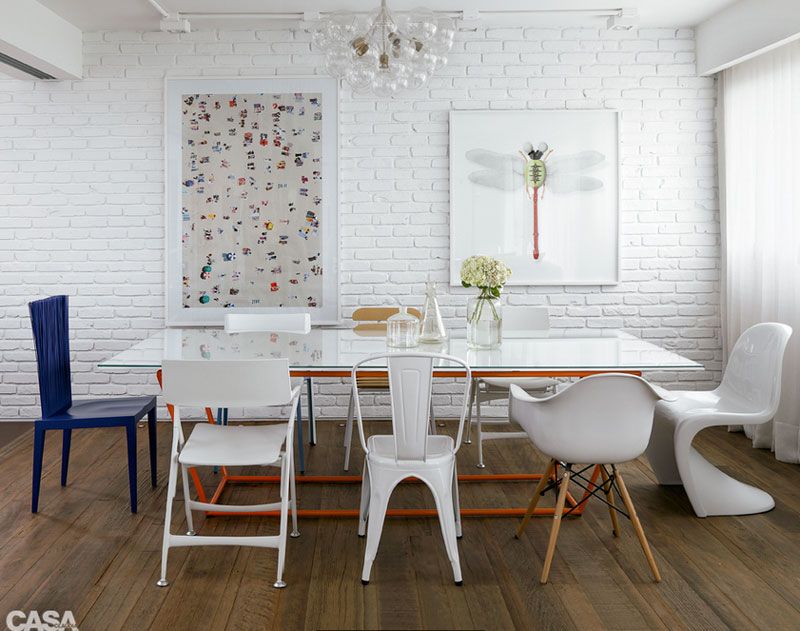 Деревянный стол с белыми стульями очень красиво смотрятся вместе, точно так же, как сочетание простых белых и кирпичных стен хорошо сочетается с контрастной текстурой.