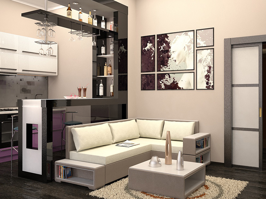 Уже нельзя будет оставить в раковине немытую посуду и на ночь мусор в ведре с одной стороны. А с другой стороны и спальная зона всегда должна быть очень чистой. Никаких смятых и застиранных простыней, только идеально отутюженное красивое белье, цвет которого будет гармонировать с общей отделкой помещения. Поэтому необходимо будет подумать и об этом заранее. - В-третьих, какую-нибудь мебель в таком помещении не поставишь. Спальное место, все же, должно быть полноценным, удобным и рациональным. Придется раскошеливаться на угловой диван-трансформер, обитый практичной легко очищающейся кожей. Она не впитывает запахи, за ней легче ухаживать.