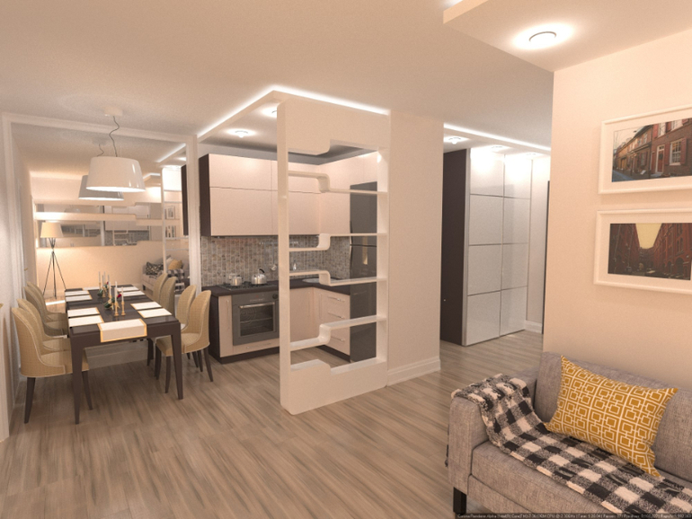 Обратите внимание на то, что секрет обустройства общего помещения заключается именно в правильном оформлении комнаты. Единый декор с визуальной разбивкой на комнаты – вот то, что необходимо будет реализовать.