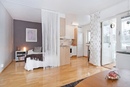Если правильно расставить акценты, то дополнительная кухня и спальня вполне существовать в одном пространстве, не перегороженном стенами.
