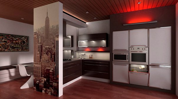 Чтобы свести к минимуму неудобства, дизайн кухни спальни продумывается с особой тщательностью: кухню необходимо будет оборудовать так, чтобы техника производила минимум шума, располагалась как можно дальше от спального места. Придется более тщательно продумать систему вентиляции, приобрести и установить вид мощной кухонной вытяжки.