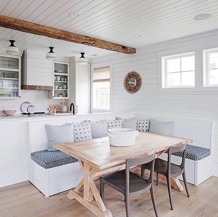 Это светлая и преимущественно белая столовая внутри кухни с таким же белым корабельным потолком и белым полом. Яркость приглушают деревянная столешница обеденного стола и висящая над ней черная люстра в деревенском стиле.