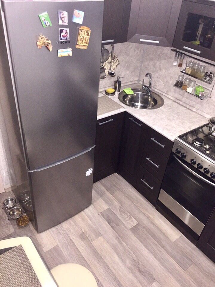 А планировка кухни в хрущевке с холодильником позволит разместить мини-холодильник. Тем более, он легко поместится в небольшой шкафчик.