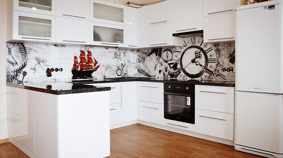 Стеклянный фартук легко мыть, а из-за отсутствия пор и швов грязь не будет забиваться в щели и скапливаться там. В то же время на стекле хорошо заметны отпечатки пальцев или засохшие капли жира и воды, поэтому очистку такой поверхности придется проводить регулярно.